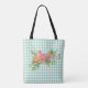 All over print tote bag done in a mint green and white gingham checked pattern, with watercolor graphics of a colorful peony floral bouquet. Customize to add your own text to this pretty all purpose bag.