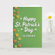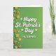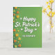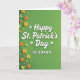 This greeting card features a rich green background that shifts from deep emerald at the edges to a lighter lime glow near the center, setting a cozy St. Patrick’s Day scene 💚. Centered in the middle, white lettering reads “Happy St. Patrick’s Day” in a flowing, cursive-style look, with “Husband” placed just below in a simple sans‑serif style. A faint shadow behind the words gives the text a gentle lift from the background, like it’s floating slightly above the green field. Along the left side and lower edge, three‑leaf clovers curl and layer with soft shading, their rounded shapes feeling almost touchable. The clovers mix pale green with warm yellow and orange accents, adding a sweet, affectionate warmth that suits a couple’s closeness ☘️. Small bead-like dots in light green and yellow are scattered nearby, like tiny drops of dew or bits of confetti. The overall layout keeps the message centered and clear while the clovers frame it in a loose border, and the lower-left corner holds the densest cluster of shamrocks and dots.