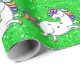 A colorful, sparkly green unicorn wrapping paper with a pattern of cute little chubby unicorns with rainbow colored hair, mane and tail, gold stars on their bodies and golden hooves. They're dancing over a glittering green background of sparkling glitter. This green unicorn wrap would be ideal for a children's birthday party gift, for unicorn crafts, and more.