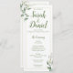 A beautiful and simple wedding program featuring green text and green florals with white flowers.