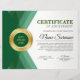 Professional modern green & gold certificate of achievement award flyer template featuring a gold outlining on "certificate", green and gold medal with leaf design, and a soft grey background. Customize to your liking.