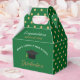 This green and gold custom senior graduation party favor box features chic white and gold typography under a high school or college name for the class of 2026. Customize with your graduating year under the lovely congratulations calligraphy for a great personalized graduate ceremony decoration. Classy polka dots decorate the sides.