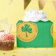 This festive Happy St. Patrick's Day wrapping paper features a green-on-green thin striped pattern with circular gold frames featuring a hand-drawn lucky clover and 2 custom texts: Title and Name. Perfect St. Patrick's Day gift wrap for all ages.