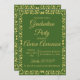Simple yet stylish graduation party invitations feature a gold leaf vine around the edge and modern gold text on a Green background. A classy and elegant look for a high school or college graduate. Customize the Green and gold graduation invitation with a photo of the graduating senior, their school and year of graduation on the back of the invite.