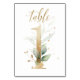 Beautiful table number card with a botanical motif - a watercolor illustration of green and gold leaves. Table 1. Please, check all available numbers