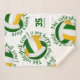 This cute volleyball themed sherpa fleece blanket features 5 randomly arranged green, gold and white volleyballs with the text, "The volleyball court is my happy place" in gold encircling each volleyball in a playful typographic font, all on a white background - her name and jersey number are customizable - by katz_d_zynes