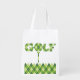 Green argyle diamond golf style patterned reusable bag. A delightful bag for anyone whom loves golf. Can be used for your shopping or for storing a bag of golf balls! Designed by Sarah Trett.