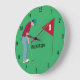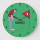 Green personalised golfer, wearing a cap, deep red shirt and blue pants, putting a golf ball design clock. Customise the text.