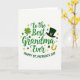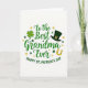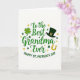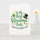 This greeting card features a bright St. Patrick’s Day layout on a white background, centered around the message “To the Best Grandma Ever” in flowing letters shaded in several greens 💚. The words sit large in the middle, with the letterforms gently curving as if they’re being written with extra care for someone beloved. In the upper left, a rounded shamrock with soft shading leans in like a friendly little nod, while a dark green leprechaun hat with a gold buckle balances the top right ☘️. Near the lower right, a golden horseshoe curves upward, adding a warm metallic contrast against the greens. Tiny four-leaf clovers and small gold star shapes are sprinkled around the main message, creating a light, confetti-like frame. Below the dedication, “HAPPY ST. PATRICK’S DAY” appears in rich green, set in a simple sans-serif line that arches gently under the main text. The overall scene is dotted with green clovers and gold accents, with the hat tilted at the top right and the horseshoe shining near the bottom right.