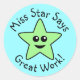 A green happy cartoon star. The text reads "Miss Star Says Great Work!" and can be changed for a custom name/message. Ideal for teachers as rewards for students.
