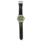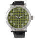 This men's watch has a mid-century modern design of solid black diamonds inside black diamond outlines on a field of green.