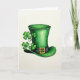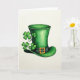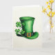 This greeting card features a watercolor leprechaun top hat in layered greens, from deep emerald shadows to lighter moss highlights, set against a white background 💚. A black band wraps around the crown, and a warm golden buckle sits front and center, catching the eye like a small shared treasure between friends. From the left side of the hat, several four-leaf clovers spill outward in different green tones, their shapes close together as if leaning in for a quiet moment ☘️. Thin curling tendrils link the clovers back to the hat, adding gentle motion and a soft, affectionate feel to the scene. Crisp dark outlines define the brim, band, buckle, and each clover leaf, giving the painting a tidy, graphic edge. There is no text on the front, leaving the illustration to stand alone without any lettering competing for attention. The hat’s brim flares slightly at the base, and the clovers trail diagonally along the left side with small curls extending into the open white space.