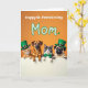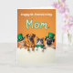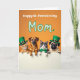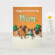 This card shows four animal friends—an orange tabby kitten, a brown dog, a grey-and-white cat, and a pug—peeking over a bright white horizontal panel, their paws resting on the edge as if they’ve gathered close together. Their wide, upward looks feel affectionate, like they’re sharing a private joke with Mom, and the pug leans in with an extra-sweet, eager expression 💚. The background is a rich orange, making the green accessories stand out: the tabby and the pug wear green top hats with small gold buckles, and the grey-and-white cat sports a neat green bow tie ☘️. Above their heads, the message “Happy St. Patrick’s Day Mom” sits centered near the top in a flowing, playful letter style, outlined in green. A small shamrock detail appears alongside the wording, tying the theme together without crowding the space. Gentle lighting brings out the fur textures and soft shading around their faces, giving the group a cozy, friendly closeness. The white panel below them stays mostly open and bright, framing their paws and faces against the orange backdrop. The final look is an orange field topped with green-outlined text and a tiny shamrock, with four animals lined up beneath it behind the white strip.