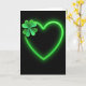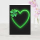 This card features a neon-green heart outline glowing against a deep, inky black background, like a sign shining in the dark. The heart sits centered on the front, with a soft inner light that fades gently into the surrounding black. Tucked into the upper-left curve of the heart is a detailed four-leaf clover ☘️, positioned like a small token shared between close friends or sweethearts. Each leaf shows fine veins and layered shades of green, adding a natural texture beside the smooth, electric glow. The contrast between the dark space and the green elements makes the heart and clover feel close and connected, as if the clover is being held safely inside the outline 💚. A short St. Patrick’s Day message appears near the bottom in light green text, centered and easy to read without taking attention from the artwork. The clover’s tiny stem angles inward toward the heart’s center, and the glow forms a thin halo around the outline.