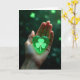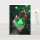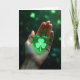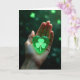 This card shows a close-up of a hand gently cradling an emerald-green heart that glows like a small lantern 💚. Inside the smooth heart, a three-leaf shamrock sits centered, lit from within so it looks suspended in glass ☘️. The hand is softly lit in warm skin tones, with light catching the knuckles and fingertips as if someone is carefully offering the heart to a friend or sweetheart. Behind it, the setting fades into a deep green blur, with scattered points of light that resemble sun-dappled leaves. The contrast between the bright heart and the muted background draws your eye straight to the shamrock at the center. Near the top, the greeting text sits in a light gold-green color, and a smaller line of text appears near the bottom in pale cream. The heart’s glow creates a gentle halo along its edges, while tiny bokeh specks shimmer in the background like distant fireflies.