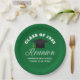 A classy custom class reunion party paper plate in green and white for a high school, college, or university. Customize with your school name and graduating class under the elegant calligraphy for great personalized alumni celebration decor.