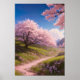 A picturesque scene unfolds as a ground pathway winds its way between lush green hills and majestic cherry blossom trees. Nature's grandeur surrounds this enchanting pathway, with vibrant hues and delicate blooms guiding your journey. This artwork captures the harmonious blend of natural beauty and tranquility, inviting you to explore the gentle allure of the pathway as it leads you through a serene landscape of rolling hills and blossoming trees.
