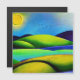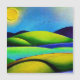 Digital watercolor landscape design in vibrant shades of blue, green, and yellow with a sun and birds.