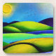 Digital watercolor landscape design in vibrant shades of blue, green, and yellow with a sun and birds.