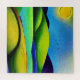 Digital watercolor landscape design in vibrant shades of blue, green, and yellow with a sun and birds.