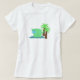 a cartoon hippo of green wading in the water. Palm trees in the background.