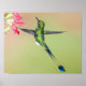 Light green print featuring Ecuador's stunning metallic green booted racket-tail hummingbird flying towards a flower with its long tail feathers gracefully stretched out behind him. This spectacular little andean hummingbird has boots of puffy white leg feathers. Beautiful and unique wall decor for hummingbird, nature and garden lovers! Photo taken at Tandayapa, Ecuador.