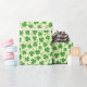 Wrapping paper featuring a pattern of three leaf clovers in two shades of green on a lighter background. Fun design, perfect for St Patrick's day.