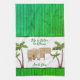 Green travel trailer kitchen towels to personalize with names. Camping saying is, “Life is better on wheels”, or change it to one of your own. Distressed green stripes background with a white panel and 5th wheel RV image. Text is also in green and palm trees decorate the edges. For couples and families who live an RV lifestyle.