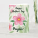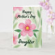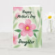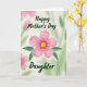 This card features a large six-petaled flower centered on the front, painted in soft pink with a sunny yellow middle that draws you in like a warm hug ❤️. Two curved green leaves sit neatly beneath the bloom, giving the design a balanced, caring look, like someone standing close by your side. Above the flower, the words “Happy Mother’s Day” are placed near the top in dark green lettering, arcing gently over the petals. Below the leaves, “Daughter” appears near the bottom in the same dark green, creating a sweet, close-knit connection between the two lines of text 👩. The background fades into a pale wash of light green and muted pink, suggesting a garden scene without sharp edges. Soft, diffused lighting makes the flower look tender and calm, like a quiet moment shared between family. The pink petals show slightly deeper pink accents near the center, while the yellow core glows against the green leaves and the misty pastel backdrop.