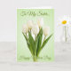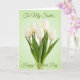This card features a tall bouquet of five creamy white, unopened flower buds rising from slender green stems, surrounded by layered emerald leaves that feel like a gentle embrace ❤️. The flowers sit along the center of the design, guiding your eyes upward as if sharing a quiet, affectionate moment between giver and receiver. Behind them, a soft green gradient shifts from slightly deeper at the top to lighter near the bottom, like early morning light settling over a garden. Near the top, the words “To My Sister…” appear in a dark forest-green, flowing lettering that looks delicate against the pale background 👩. Near the bottom, “Happy Mother’s Day” is placed in the same dark green and balanced neatly beneath the stems and leaves. The calm colors and careful spacing make the bouquet feel like it’s being offered with warmth rather than simply displayed. The leaves fan outward in overlapping shapes, with darker greens near the center and lighter edges against the fading green backdrop.