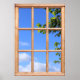 For a touch of summer days all year round, this faux window shows a blue sky with fluffy white clouds and the sunlit leaves of a tree. A soothing scene to look out on in harsher seasons. The fake frame gives this photographic poster the look of a real window. Now you can enjoy summertime at any time of year!