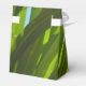 Think green with fresh greens. The long green leaves, in the original photograph by MaeFlowers on this tent style Favor Box, are palm tree leaves blowing in the breeze. Sunlight highlights some of them, making them a light yellow green color. Others are darker green as they curve out from the tree branch, throwing lime green shadows on the leaves in the sun. Bits of tropical blue sky can be seen between the leaves. There is text which is set to personalize, or delete if you prefer.