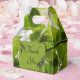 Thank you treats for your guests nestle perfectly in this rich green personalized gable gift box with beautiful trees leaves in sunlight full of the charm of nature.