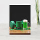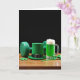 This design shows a green leprechaun hat resting on a warm, polished wooden surface, set against a deep, dark background that makes the items stand out. The hat has a soft felt look, a black band, and a gold buckle that catches the light, like a small gift waiting to be noticed 💚. Beside it, a clear glass mug is filled with emerald-green drink, topped with a thick white foam cap where tiny bubbles gather near the rim ☘️. To the left, small green shamrock cutouts sit close together as if they’ve been carefully placed for someone special to find. On the right, a neatly tied green bow tie lies angled toward the hat, suggesting a friendly, dressed-up pairing between the two. A green dumbbell sits nearby, its smooth surface reflecting the same light as the mug, adding a funny little contrast between celebration and routine. Across the top portion, the greeting “Happy St. Patrick’s Day” appears in green lettering, centered and easy to spot against the dark backdrop.