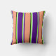 This throw pillow design features a pattern of stripes having colors like green, light cyan, indigo, light salmon, and black.