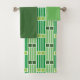 This towel set has a light green washcloth, a green hand towel, and a bath towel with a mid-century modern design of green vertical lines with rectangles above, repeated over the design.