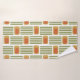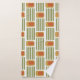 This towel set has a yellow washcloth, an orange hand towel, and a bath towel with a mid-century modern design made of five green lines and a gold rounded rectangle with an orange rounded rectangle repeated across the design.