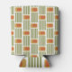 This can cooler has a mid-century modern design made of five green lines and a gold rounded rectangle with an orange rounded rectangle repeated across the design.