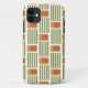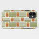 This phone case has a mid-century modern design made of five green lines and a gold rounded rectangle with an orange rounded rectangle repeated across the design.