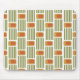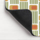 This mouse pad has a mid-century modern design made of five green lines and a gold rounded rectangle with an orange rounded rectangle repeated across the design.