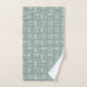 This towel set has a mid-century modern design of sets of five white lines, alternately horizontal and vertical, repeating across the design on a retro green background. If you like the design but want different colors, message me.