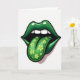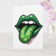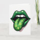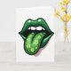 This greeting card features a centered pop-art mouth with glossy green lips outlined in thick black, with tiny white highlights that make them look slick and shiny. Inside the dark mouth, bright white teeth frame an extended green tongue that reaches forward like a teasing kiss between close friends. Scattered across the tongue are small shamrocks in lighter green with a glitter-like sparkle, adding a flirty St. Patrick’s Day wink ☘️. The strong contrast of black, white, and layered greens keeps the image crisp and eye-catching while still feeling intimate and cheeky. Along the top, the greeting text sits in a simple white font, and a smaller line of text appears near the bottom in light green to match the shamrocks 💚. The background stays plain so the mouth and tongue remain the main focus, with no extra objects or scenery. The tongue is dotted with shamrocks of different sizes, clustered more densely near the tip and thinning toward the back of the mouth.