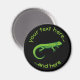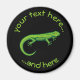 Green lizard icon with woodcut shading. Two custom text fields on circle.