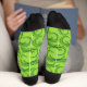 Green lizard icon with woodcut shading. Seamless pattern. Custom background color. Custom top stripe color. Custom text on each sock.