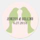 Stylish wedding envelope seal / favor sticker, done in a very light pale pink background, with graphics of two green silhouettes of love birds facing each other. Personalize the dark gray text for your special day. Matching products available.