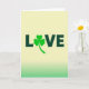 Designed with deep forest-green letters spelling “LOVE,” this St. Patrick’s Day card keeps the focus on a simple, romantic message. The “O” is replaced by a three-leaf shamrock in brighter emerald green ☘️, giving the word a lucky twist and a sweet, shared-in-joke feel between two people. Each letter is uppercase and centered, with generous spacing that makes the design feel calm and steady. The main word sits in the middle of the front, with no extra phrases competing for attention, so your eyes stay on the shamrock-heart idea. Behind the lettering, the background fades in a vertical gradient from creamy yellow at the top to fresh lime green at the bottom 💚. The shamrock’s stem curves gently, softening the straight edges of the typography and adding a tender, leaning-toward-you motion. The brightest green is concentrated in the shamrock, while the darker green anchors the other letters against the light-to-green gradient.