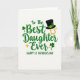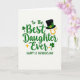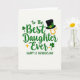 This card features a white background with the message “to the Best Daughter Ever” centered in rich green lettering with soft shading, giving the words a gently raised look 💚. Around the main line, St. Patrick’s Day icons add a festive frame, like a black leprechaun top hat in the upper right with a green band, a gold buckle, and a small shamrock tucked in for a charming touch ☘️. Golden horseshoes and small yellow stars are scattered nearby, like little sparks that draw the eye back toward the message. The layout feels affectionate, as if the decorations are leaning in to spotlight the daughter-focused words without crowding them. Near the bottom, “HAPPY ST. PATRICK’S DAY” appears in uppercase letters, set in green and aligned neatly as a finishing line. The contrast between the green and gold elements against the white space keeps everything easy to read and visually balanced. A few stars sit between the central text and the lower greeting, while the hat remains slightly tilted at the top right.