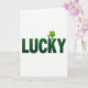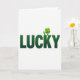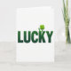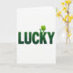 This card centers the word “LUCKY” in large, all-caps sans-serif letters on a bright white background, keeping the layout simple and easy to read. The letters are shaded in layered greens, moving from deep forest tones near the bottom to lighter emerald highlights along the top edges, giving them a gentle 3D look. That soft glow in the coloring feels like a sweet nudge between friends—or a quiet, affectionate wink—without adding any extra clutter. A four-leaf clover ☘️ sits on top of the “Y,” its curved stem leaning slightly as if it just settled there. The clover’s leaves look glossy and rounded, with lighter green reflections that draw your eye upward. The text stays centered and dominates the space, with no extra wording competing around it, so the green message carries the whole design 💚. The white background stays open and airy, making every green detail stand out sharply, especially the clover perched neatly above the last letter.