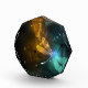 Flight of glowing, green, artistically drawn dragonfly with transparent green and yellow wings on glowing night background with marsh plants and fireflies. Glowing dragonfly.