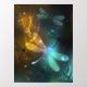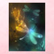 Flight of glowing, green, artistically drawn dragonfly with transparent green and yellow wings on glowing night background with marsh plants and fireflies. Glowing dragonfly.